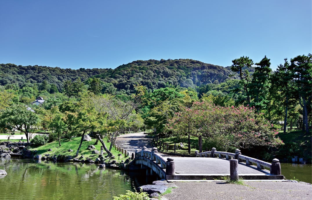 through the gardens, the elegant Taiheikaku Bridge appears, its reflection shimmering in the pond below.