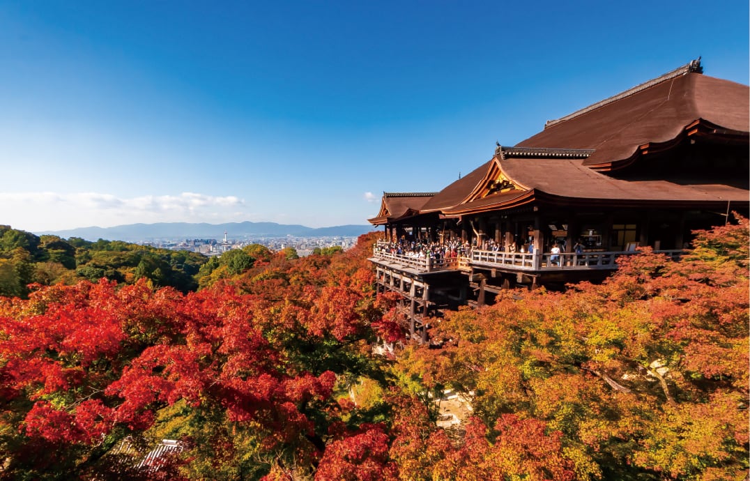 The panoramic view from the wooden stage of Kiyomizu-dera captivates visitors throughout the seasons. Founded